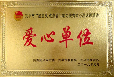 2019年1月,在興平市“星星火,點點愛”助力脫貧微心愿認(rèn)領(lǐng)活動中,寶塔山漆被共青團(tuán)興平市委、興平市教育局、興平市扶貧辦評為“愛心單位”