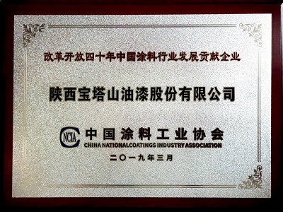 2019年3月,寶塔山漆被中國涂料工業(yè)協(xié)會評為“改革開放四十周年中國涂料行業(yè)發(fā)展貢獻(xiàn)企業(yè)”