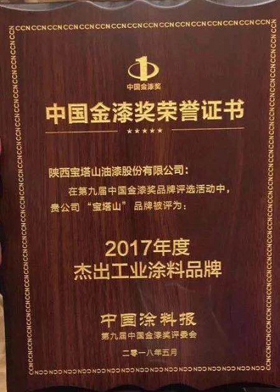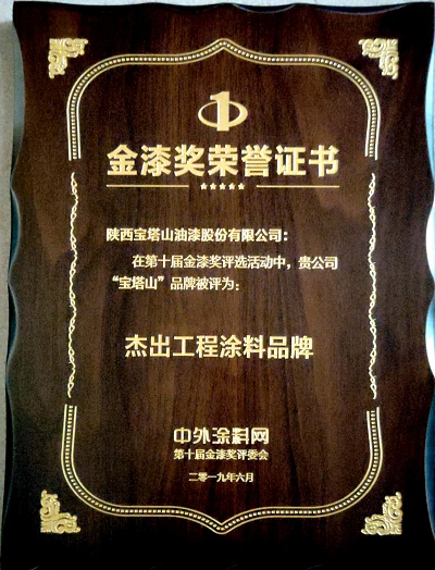 2019年6月,寶塔山漆的“寶塔山”品牌在中外涂料網(wǎng)第十屆金漆獎評選活動中被評為“杰出工程涂料品牌”