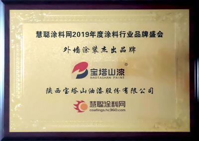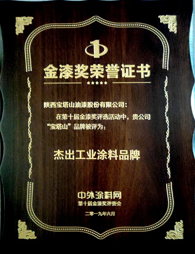 2019年6月,寶塔山漆的“寶塔山”品牌在中外涂料網(wǎng)第十屆金漆獎評選活動中被評為“杰出工業(yè)涂料品牌”