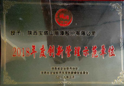 2018年3月,寶塔山漆被陜西省企業(yè)信用協(xié)會與陜西省企業(yè)信用年度創(chuàng)新峰會組委會評為“2018年度創(chuàng)新管理示范單位”