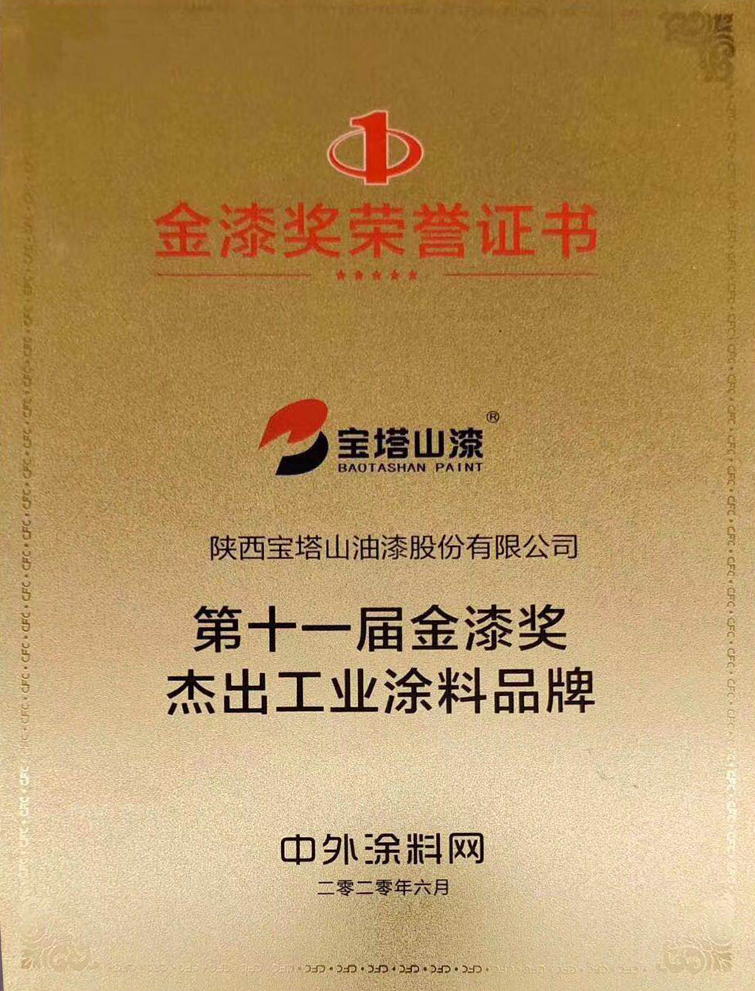2020年6月,寶塔山漆榮獲第十一屆金漆獎“杰出工業(yè)涂料品牌”