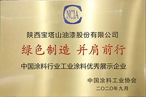 2020年9月,寶塔山漆獲評“中國涂料行業(yè)工業(yè)涂料優(yōu)秀展示企業(yè)”