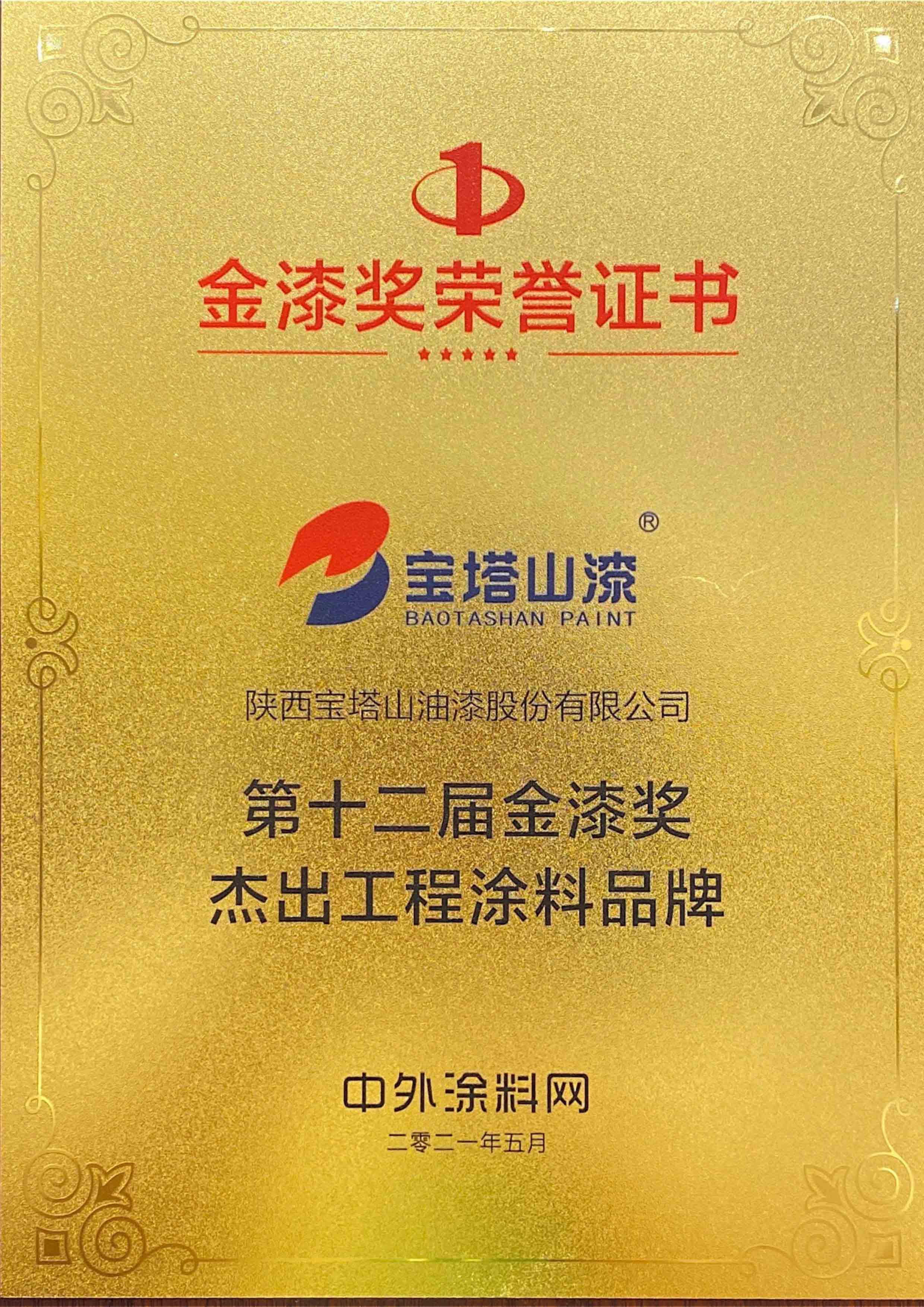 2022年6月,寶塔山漆榮獲第十三屆金漆獎“杰出工程涂料品牌”。