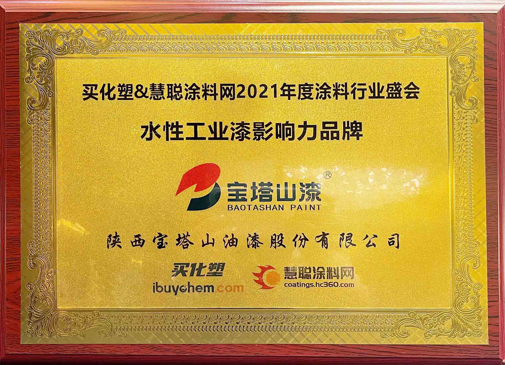 2021年6月26日,寶塔山漆榮獲2021 年度“水性工業(yè)漆影響力品牌 ”