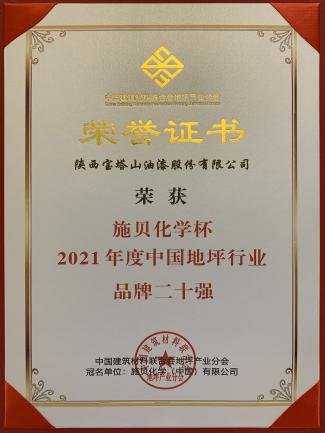 2022年3月,寶塔山漆榮獲“施貝化學(xué)杯2021年度中國地坪行業(yè)品牌二十強(qiáng)”。