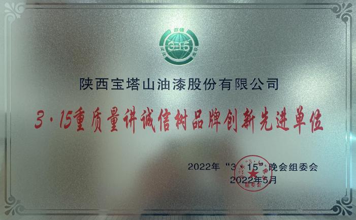2022年5月,寶塔山漆榮獲“3·15重質(zhì)量講誠信樹品牌創(chuàng)新先進(jìn)單位”。